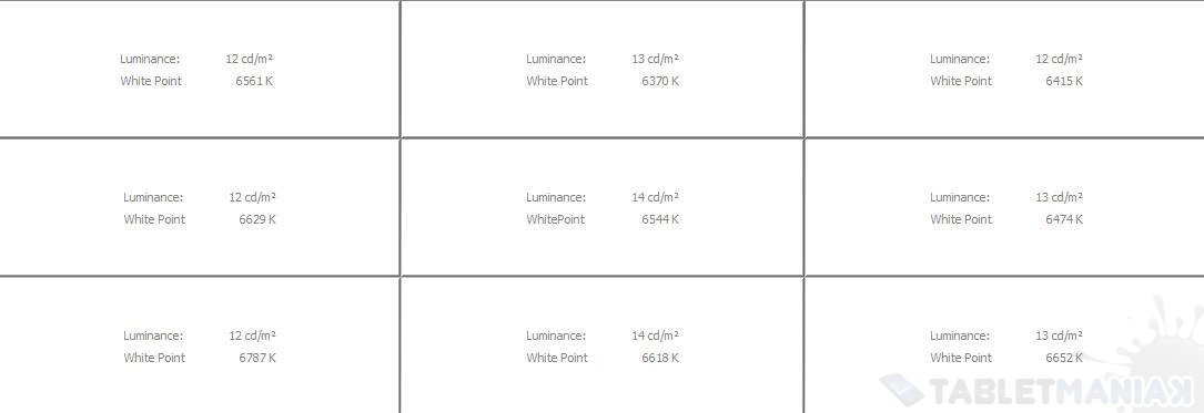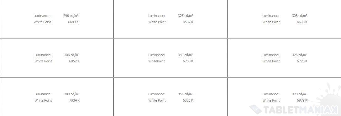 Oprócz niskiej rozdzielczości, ekran tabletu ma problemy z podświetleniem. Otrzymany wynik w pomiarze maksymalnej iluminacji udało się otrzymać wartość równą 351 cd/m2. Choć nie wydaje się to całkiem mało (spotkamy wiele tabletów, które odnotowało podobny wynik), to w praktyce przekłada się to na problemy z obsługą w słoneczne dni. Producent mógłby postarać się o powłokę antyrefleksyjną. Minimalna wartość podświetlenia wynosi 12 cd/m2, co nie jest wynikiem złym.